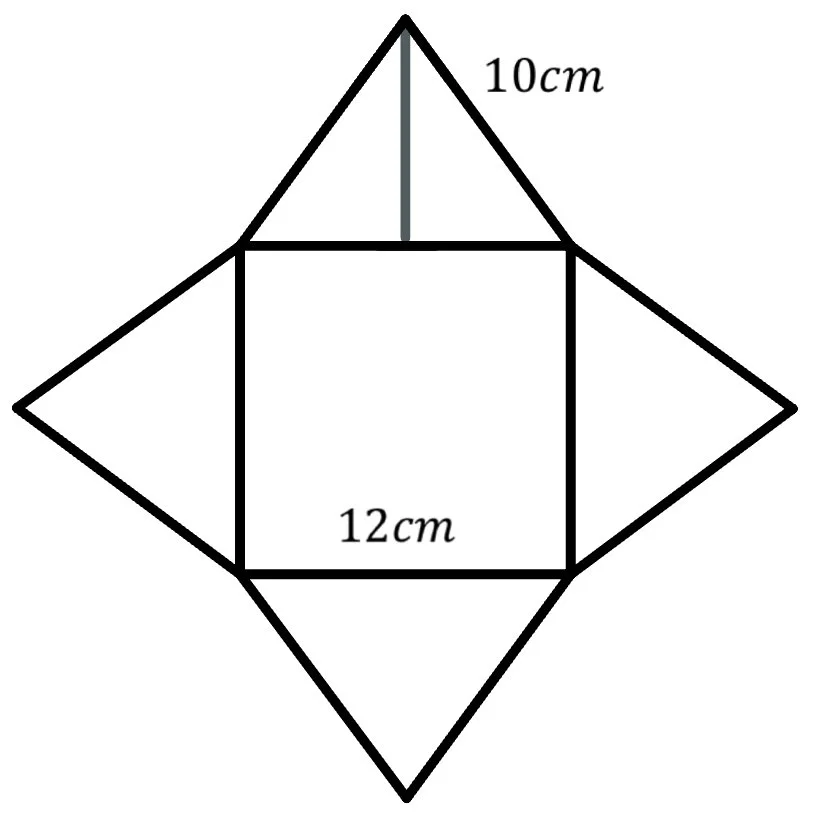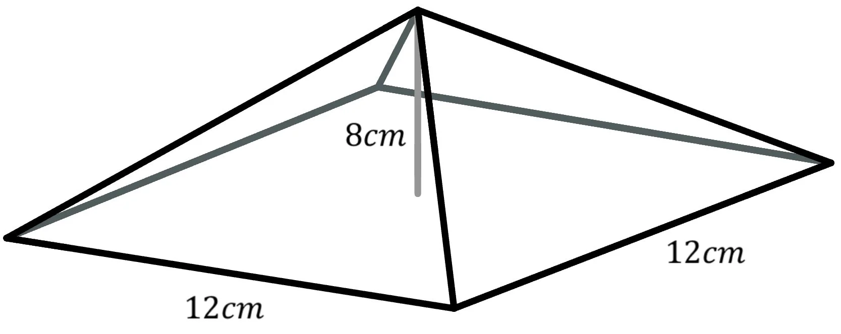 Hér til hægri er pýramídi sem hefur hæðina 8 sentimetrar, grunnflötur hans hefur hliðarlengdirnar 12 sentimetrar, og hæð þríhyrninganna er 10 sentimetrar. Hvert er yfirborðsflatarmál hans?